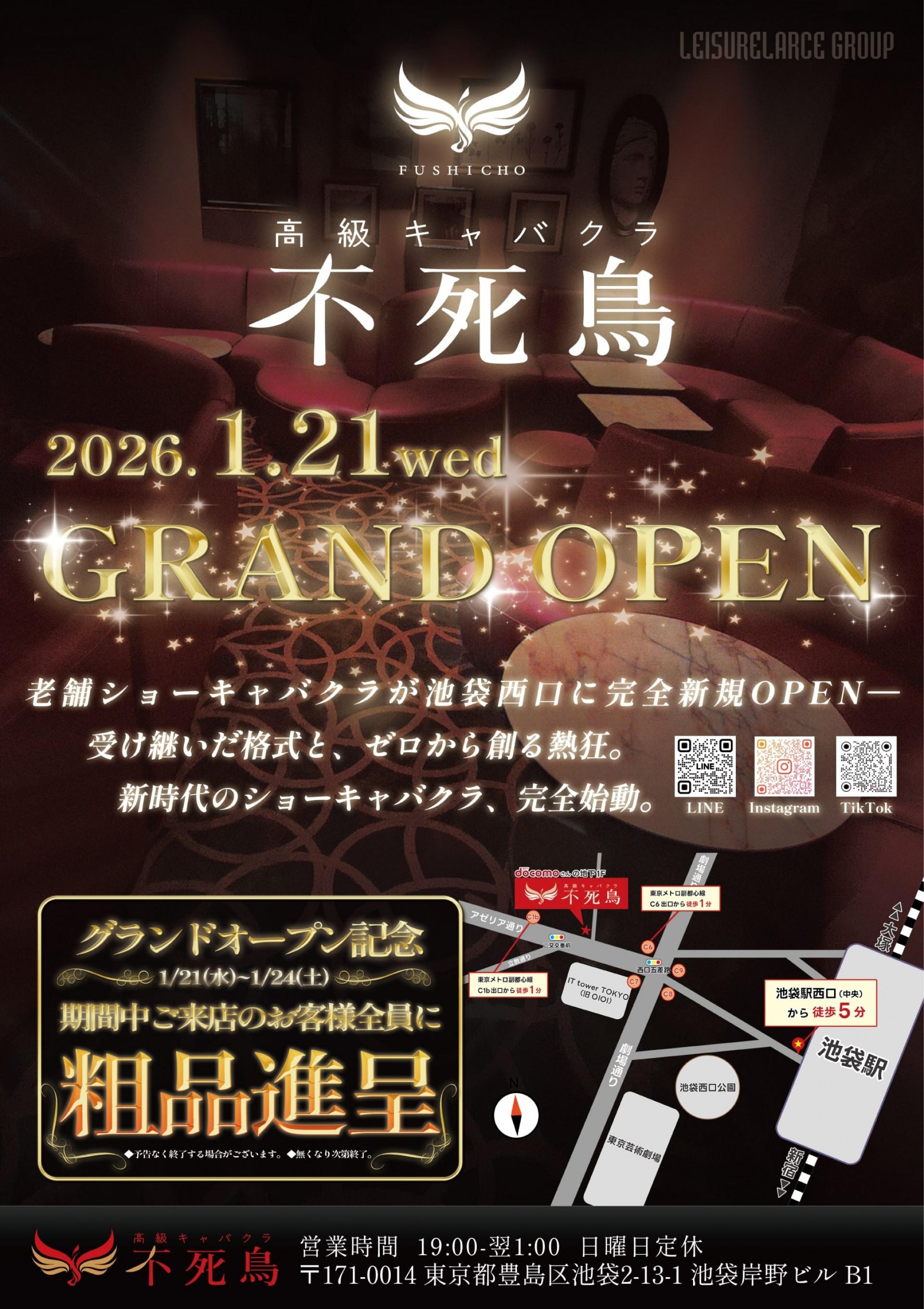news 2025.12.22 閉店のお知らせと新店舗オープンのご案内 時下ますますご清栄のことととお喜び申し上げます。 平素は格別のご高配を賜り、厚くお礼申し上げます。 この度、当店「池袋フェニックス」は誠に勝手ながら、 2025年12月30日(火)を持ちまして現在の営業を終了し、閉店させて頂く運びとなりました。 開店以来、長きにわたり多大なるご愛顧とご支援を賜りましたこと、 スタッフ一同、心より感謝申し上げます。 この度の閉店は、さらなる事業の発展を目指し、心機一転、 新たな店舗での営業準備を進めるためのものでございます。 つきましては、装いも新たに池袋西口エリアにて、新店舗をオープンする予定でございます。 新店舗名 不死鳥 オープン日 2026年1月21日(水) 場所 〒171-0014 東京都豊島区池袋2-13-1池袋岸野ビルB1 営業時間 19:00-翌1:00 日曜定休 みなさまにはご不便、ご迷惑をお掛け致しますが、 何卒、ご理解を頂けますようお願い申し上げます。 新店舗におきましても、皆様にご満足頂けますよう、 より一層のサービス向上に務める所存でございますので 変わらぬご愛顧を賜りますよう、心よりお願い申し上げます。